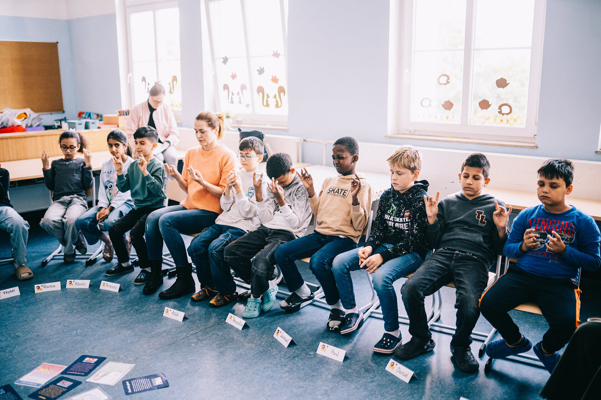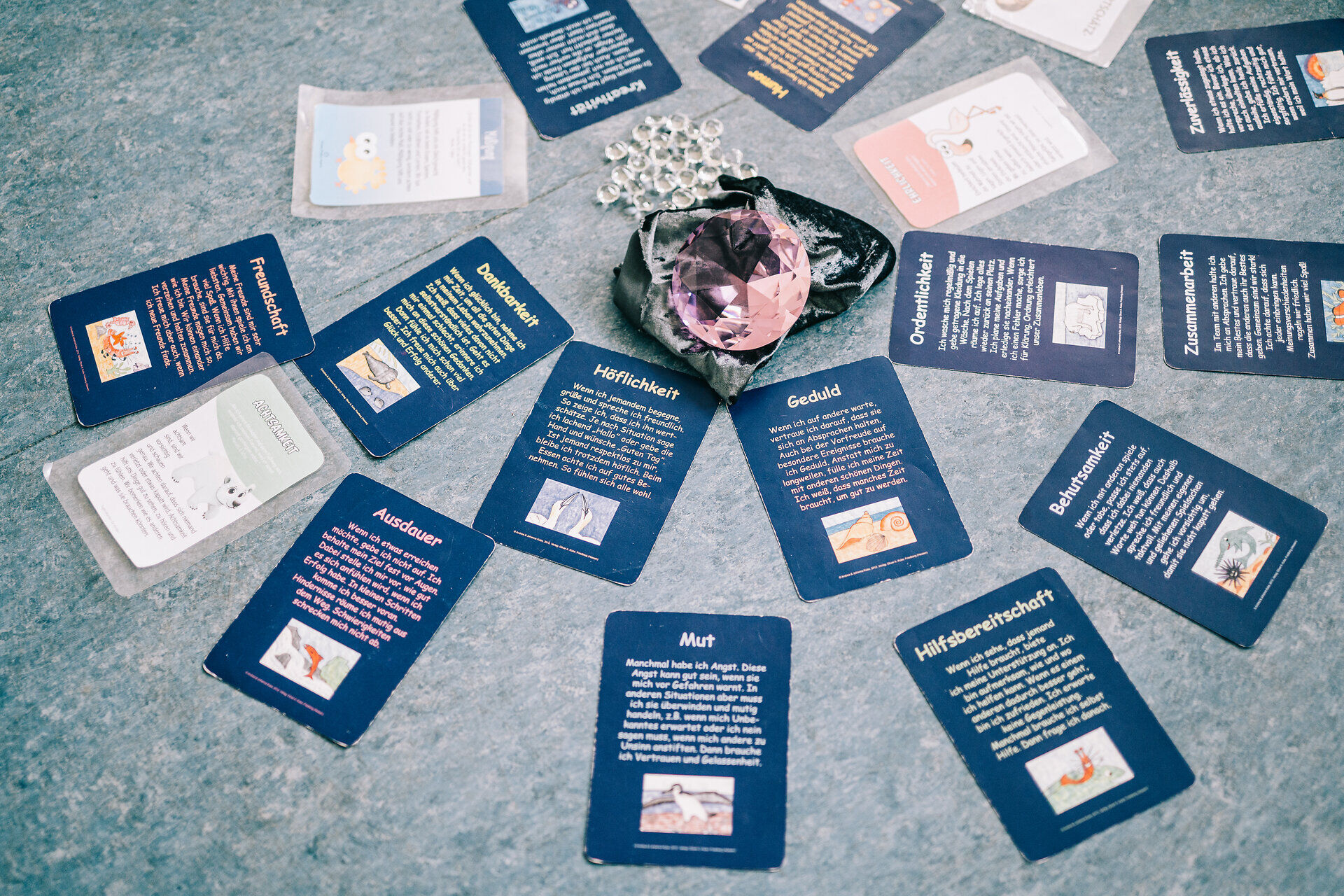 An diesem Mittwoch im Herbst sitzt die vierte Klasse im Stuhlkreis um einen riesigen, glänzenden Diamanten herum, den Seidel-Rarreck auf ein dunkles Seidentuch gelegt hat. Ringsherum drapiert sie Karten. „Durchhaltevermögen“ steht darauf, „Hilfsbereitschaft“ oder „Behutsamkeit“. „Der Diamant steht als Symbol für alle Tugenden, die wir in uns tragen“, erläutert Seidel-Rarreck. Doch das wissen die Kinder längst, schließlich haben sie im vergangenen Schuljahr schon zahlreiche positive Begriffe gelernt. „Ordentlichkeit bedeutet, dass ich ein Spielzeug wieder auf seinen Platz lege“, erklärt Lina. „Mit Humor bringe ich Menschen zum Lachen“, meint Ömer. „Wenn ich Angst habe und mich überwinde, dann ist das mutig“, sagt Layla. Und Alicia veranschaulicht, was Kreativität heißt: „Man hat selbst etwas im Kopf und macht nicht nur das, was andere machen.“ Am Ende der Stunde überreicht Seidel-Rarreck jedem Kind einen gläsernen Edelstein – damit es sich immer daran erinnert, wie viele Stärken in ihm schlummern.